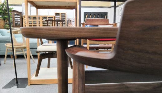 どうしても幅が大きくなるアームチェアに対して、アームのない椅子は幅がコンパクトです。テーブルの幅が150㎝くらいの場合はサイズ的にアームあるものと無いものを組み合わせるのも検討しても良いかもしれません。
